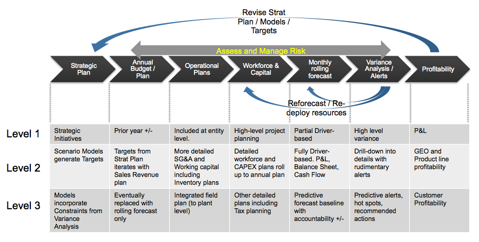I was asked to show how all of the part of an organization’s budgeting, planning and forecasting come together and support each other, and how the organization can get more sophisticated at forecasting.  This diagram helped explain the overall flow as well as some of the elements you would want to put on a roadmap.